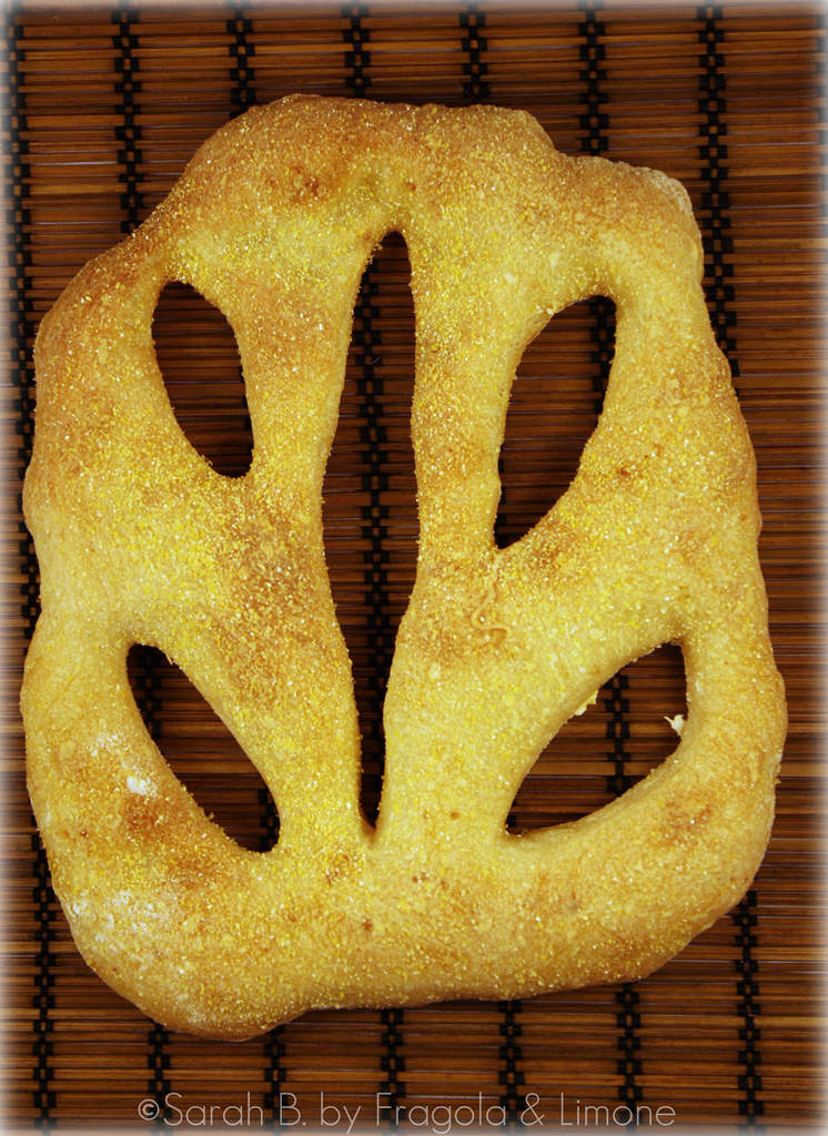 Disponete le fougasses sulla teglia foderata di carta forno, allargate un po’ i tagli e spolverizzate (se vi piace) con farina di mais.